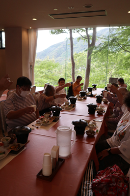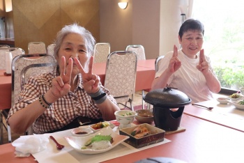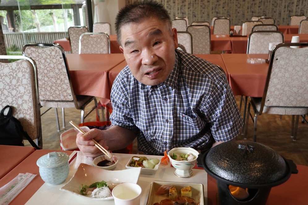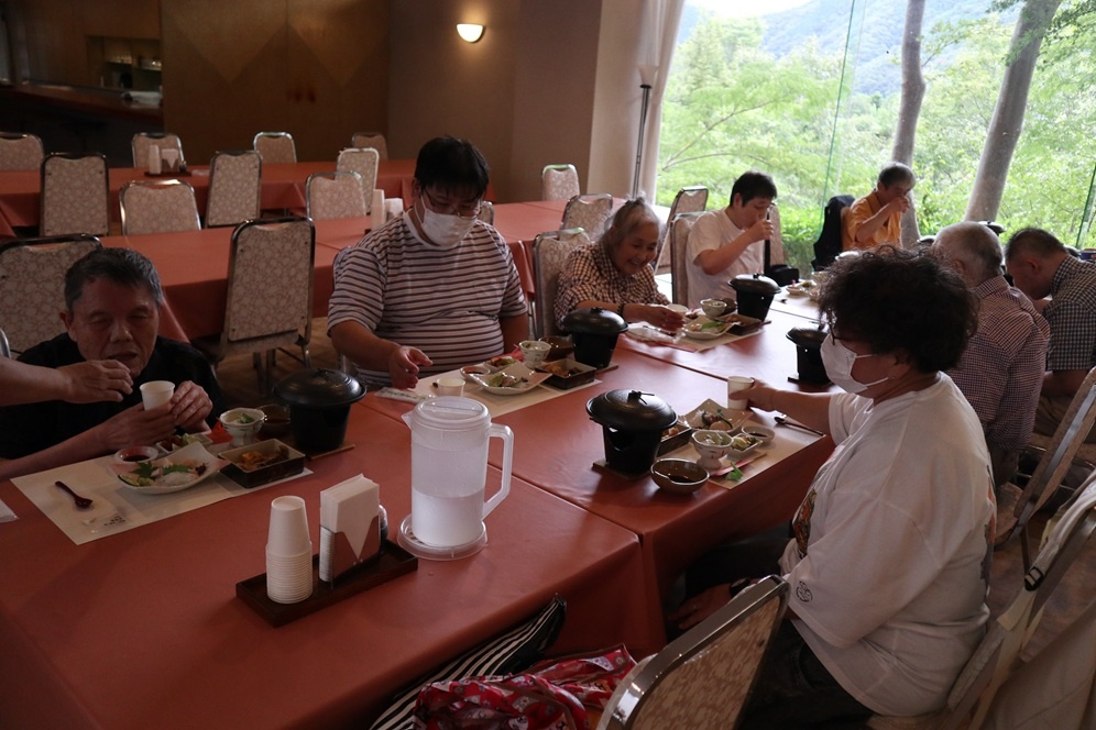 さて、かがやき班では秋の旅行に出発しました。今年の旅はそれぞれの故郷を知ろうをテーマに旅をしていきます。今回は温泉で有名な塩江です。お風呂大好きな皆さんで温泉にゆっくり浸かり、そして、豪華なお食事を楽しみます。まずはカンパーイの音頭で始まります。