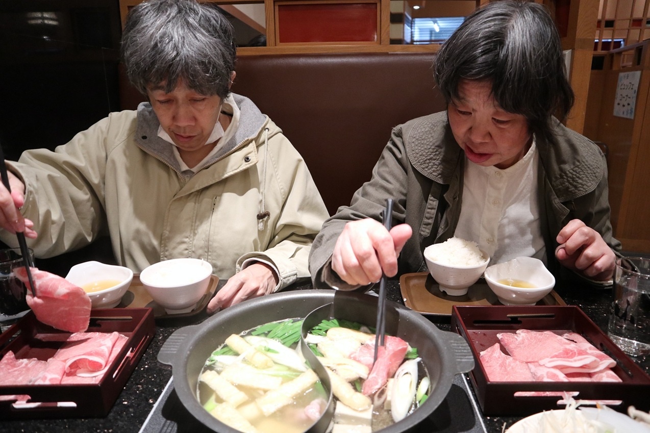 2種類のスープで、お肉や野菜をしゃぶしゃぶします…。しっかり火を通してくださ~い。